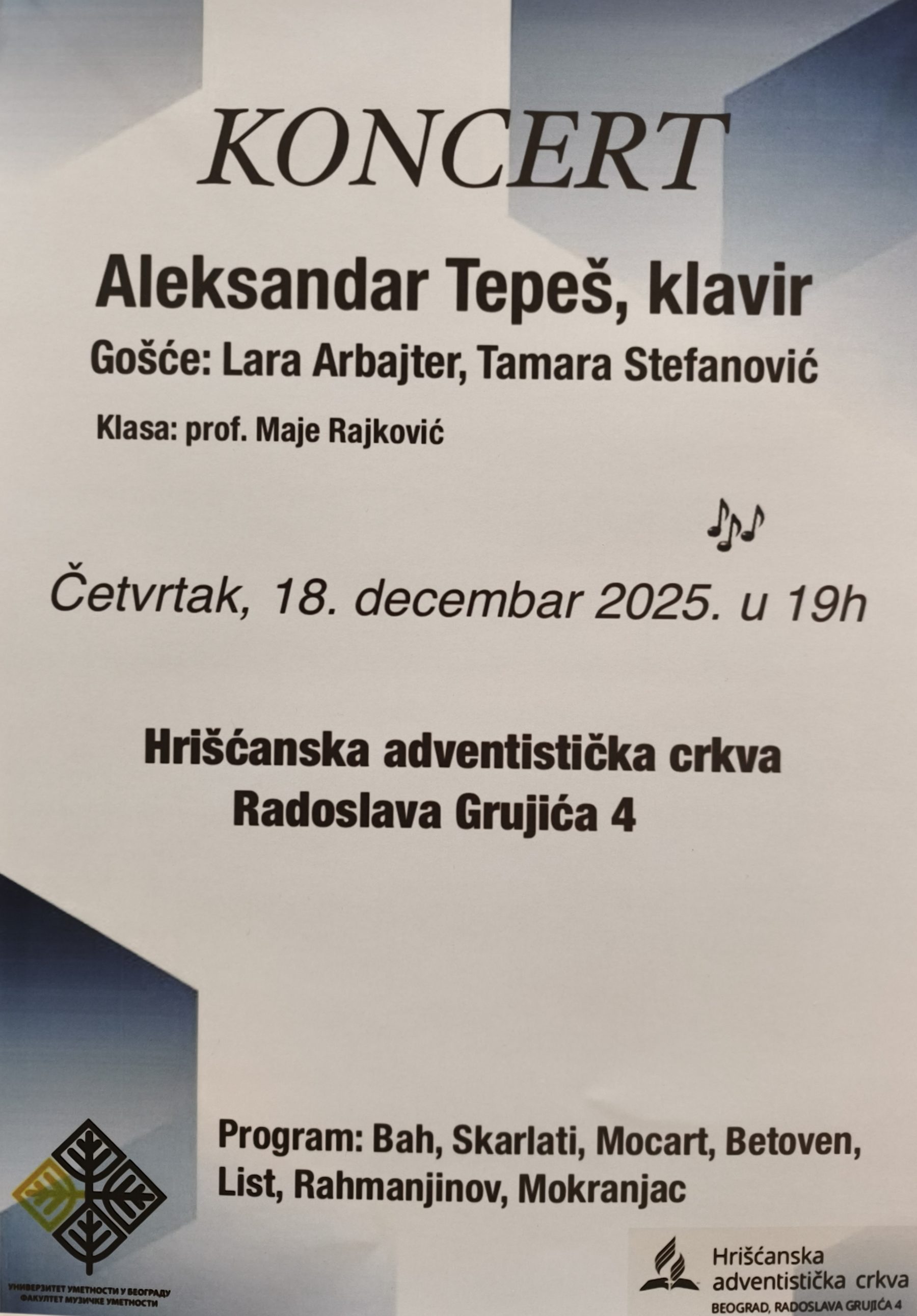 Свечаност поводом обележавања Дана Факултета музичке уметности одржаће се у петак, 21. новембра 2025. године, са почетком у 12 часова, у Великој сали ФМУ.