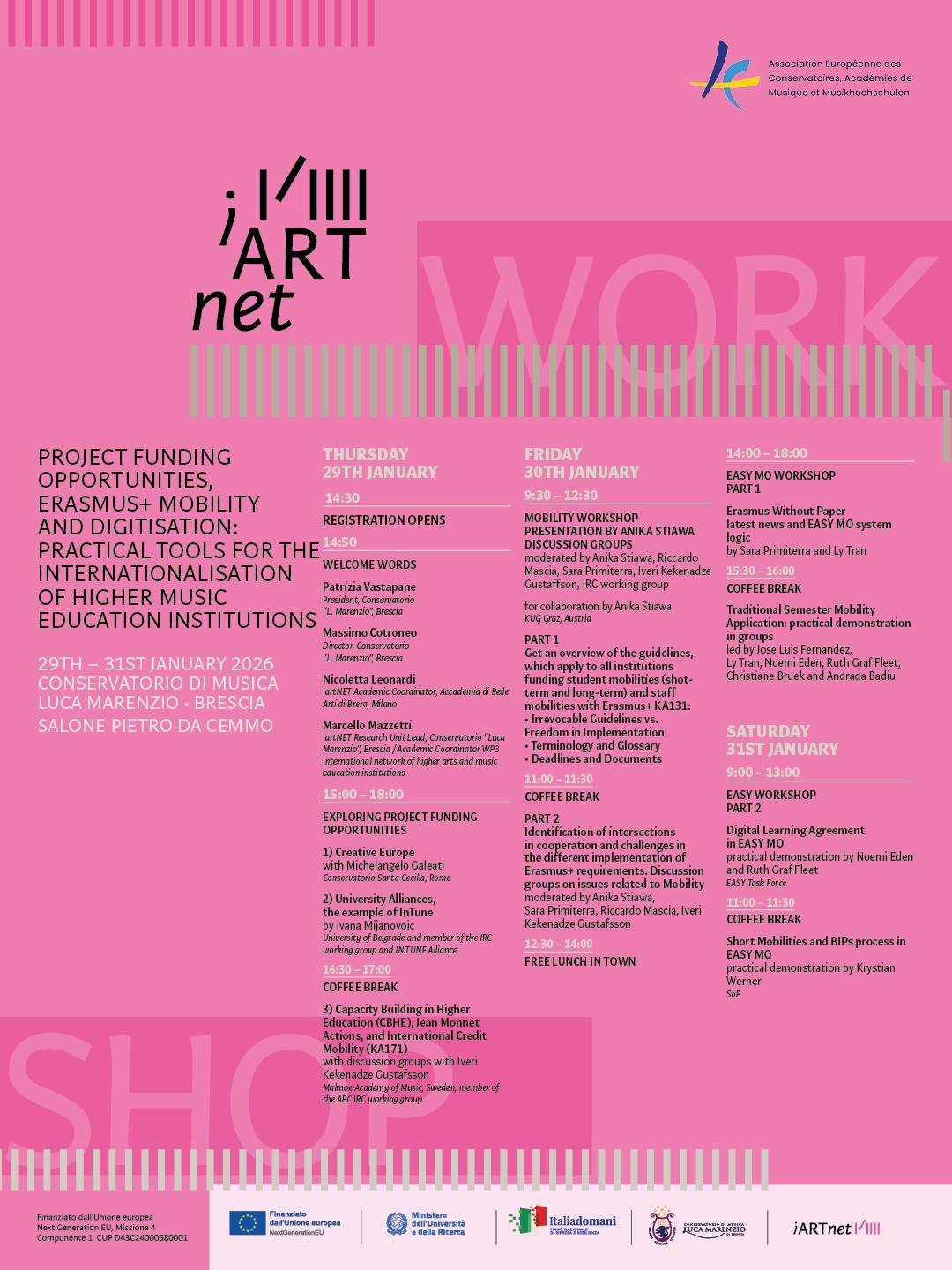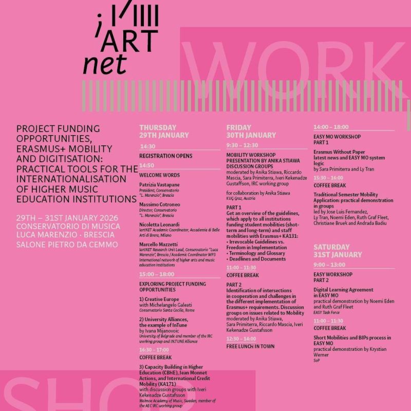 У периоду 29–31. јануара 2026. године, у Конзерваторијуму „Лука Маренцио“ у Бреши, одржан је међународни iARTnet Workshop посвећен пројектном финансирању, Ерасмус+ мобилностима и дигитализацији у високом музичком образовању.