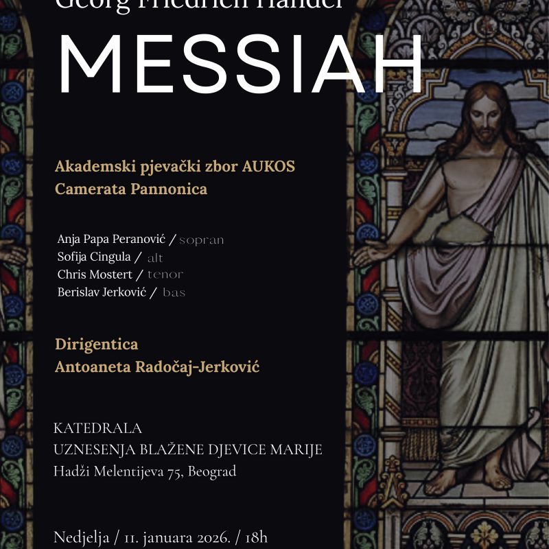 Г. Ф. Хендл: Месија у извођењу Академског пјевачког збора AUKOS и Camerata Pannonica оркестра Академије за умјетност и културу у Осијеку – недеља 11. јануар у 18 часова, катедрала Узнесења Блажене Дјевице Марије (Хаџи Мелентијева 75, Београд)