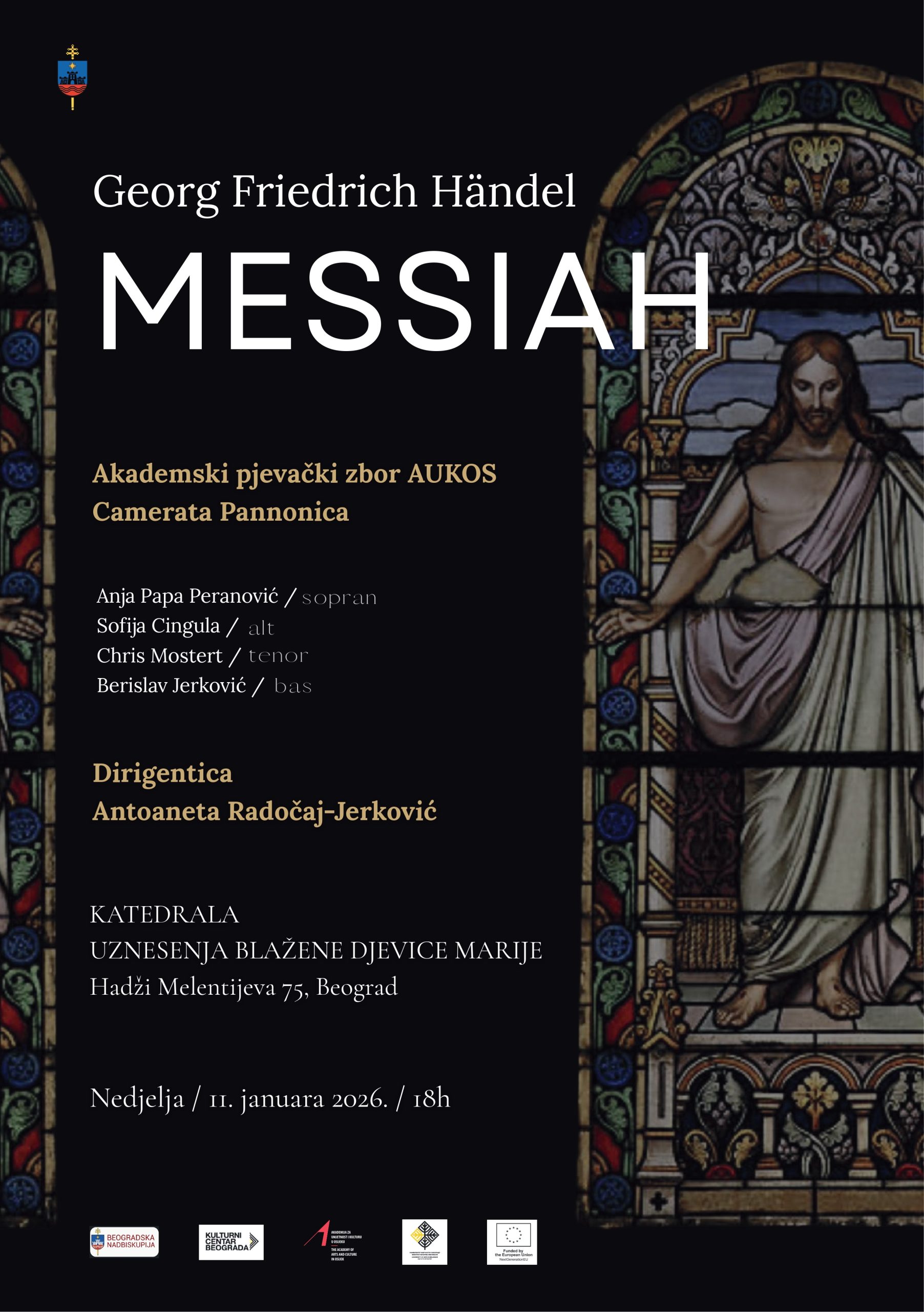 Г. Ф. Хендл: Месија у извођењу Академског пјевачког збора AUKOS и Camerata Pannonica оркестра Академије за умјетност и културу у Осијеку – недеља 11. јануар у 18 часова, катедрала Узнесења Блажене Дјевице Марије (Хаџи Мелентијева 75, Београд)