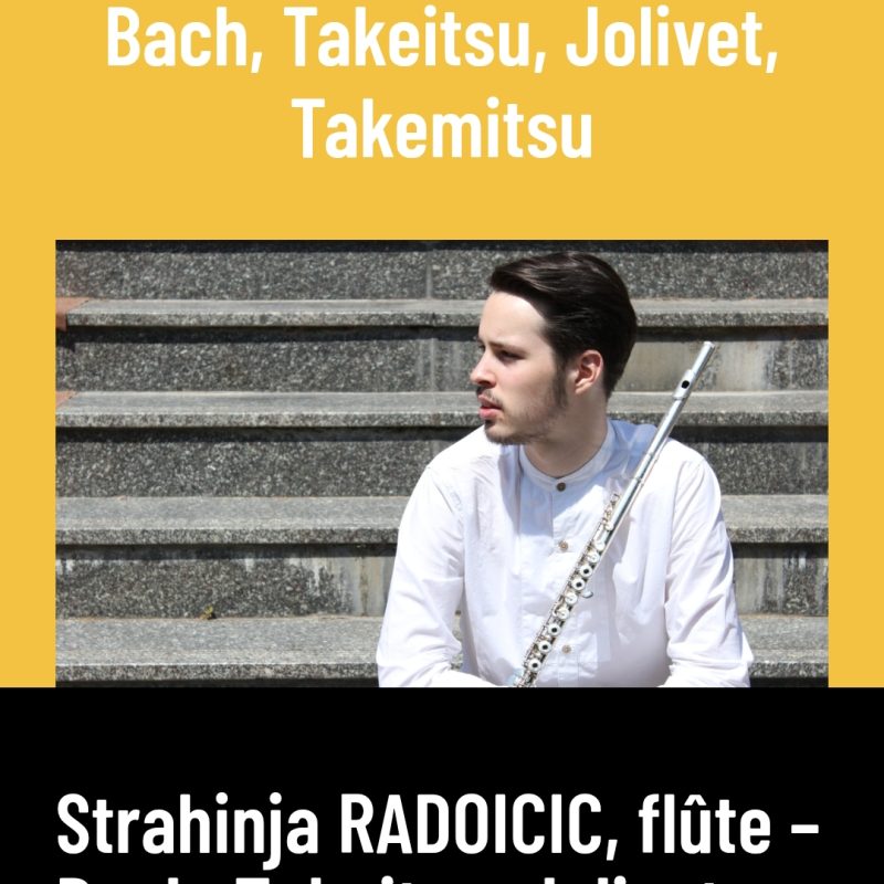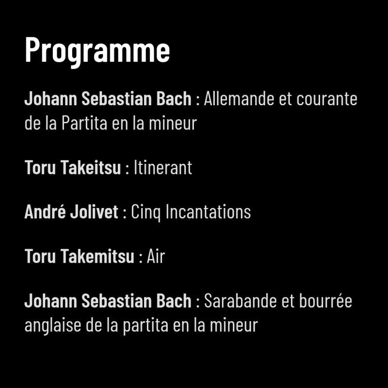 На програму ће се наћи искључиво дела за флауту соло Јохана Себастијана Баха, Т. Такемицуа и Андреа Жоливеа.