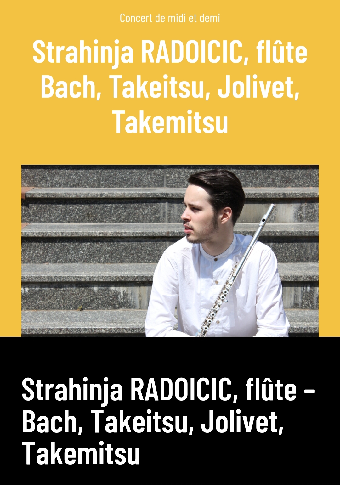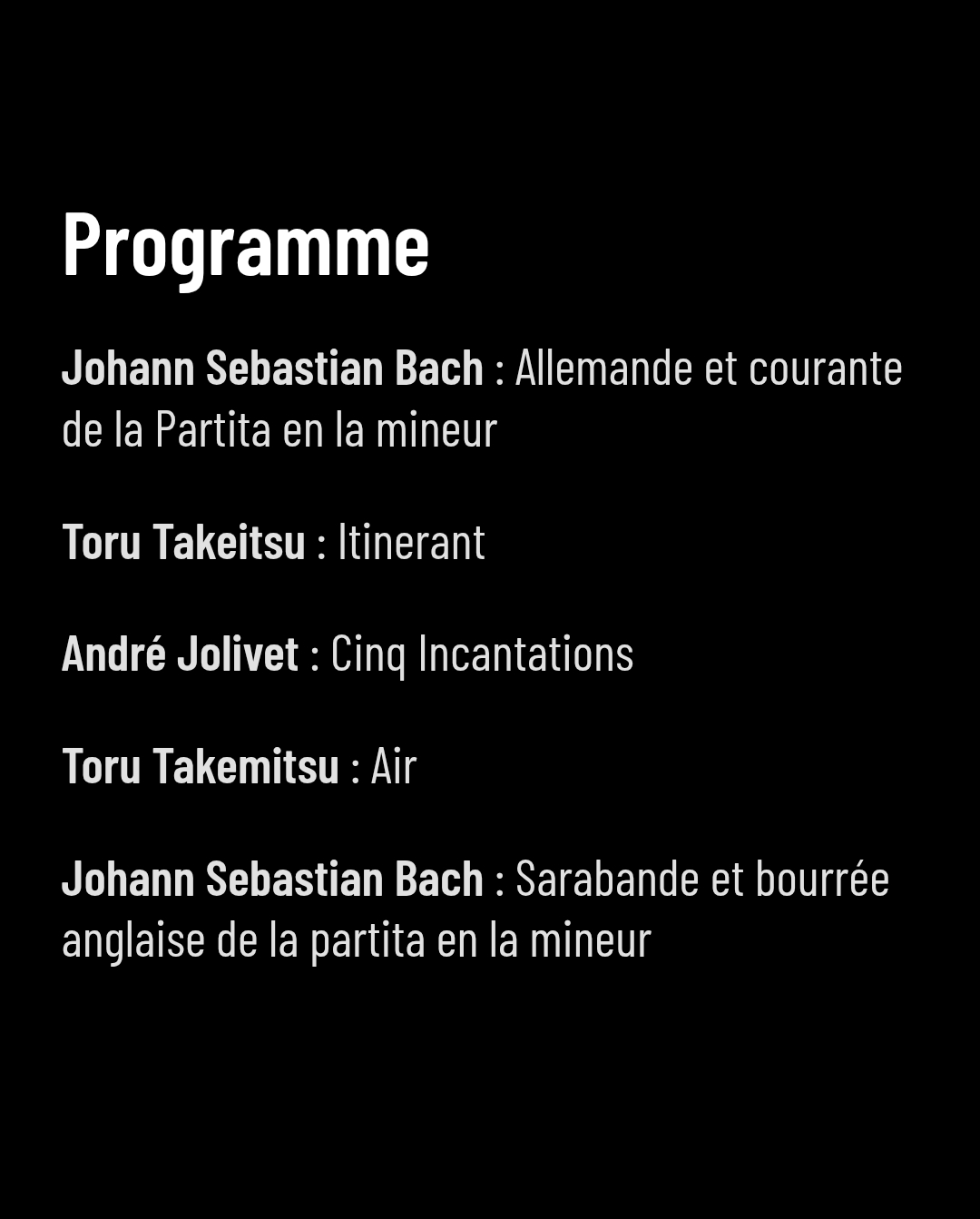 На програму ће се наћи искључиво дела за флауту соло Јохана Себастијана Баха, Т. Такемицуа и Андреа Жоливеа.