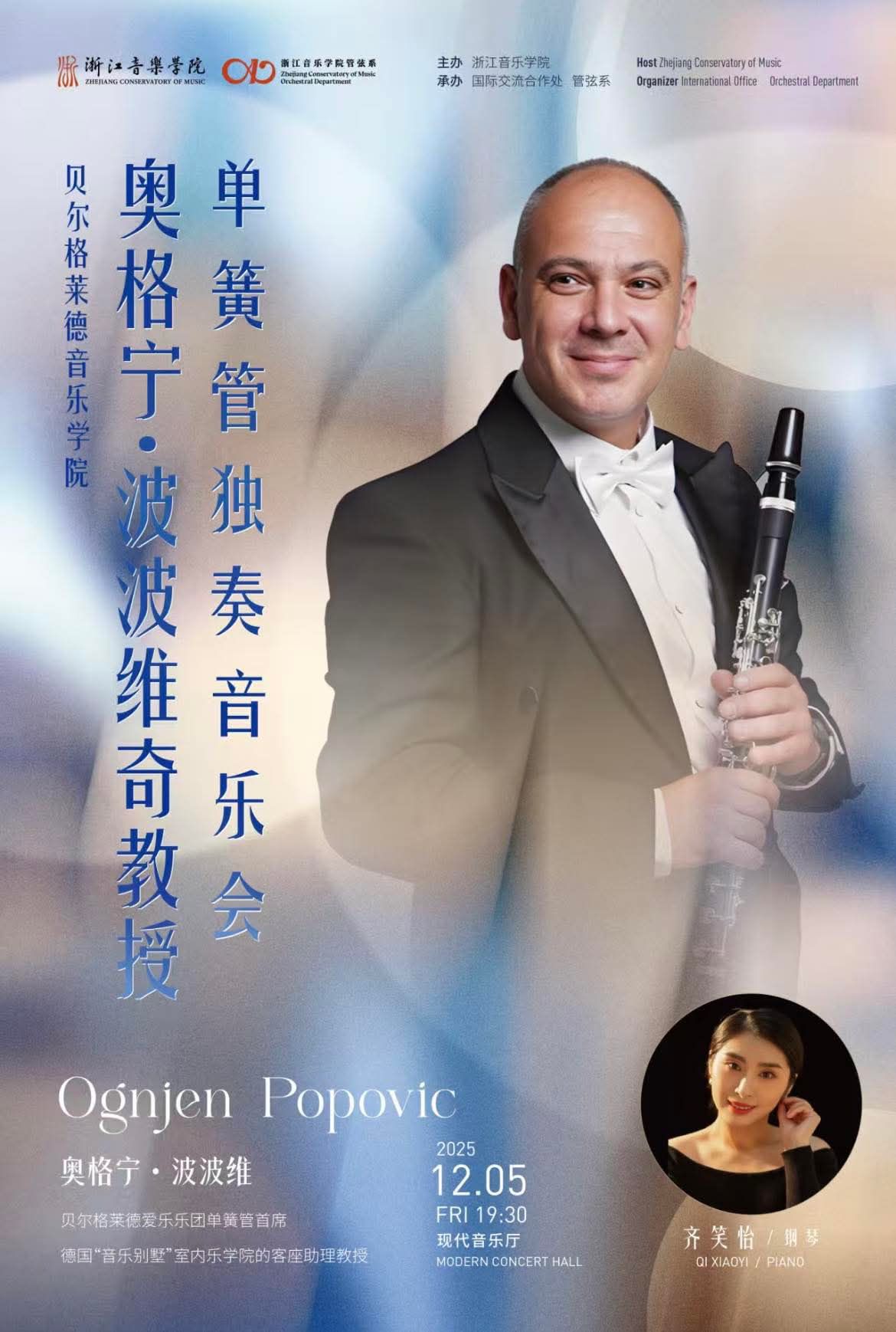 Ванредни професор за ужу уметничку област кларинет, др ум. Огњен Поповић, боравиће следеће недеље у Кини, где ће одржати стручни курс и концерт на једном од најзначајнијих музичких универзитета у Азији – Zhejiang University of Music.